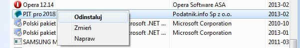 3.       Odszukaj program "PIT pro 2025" a następnie kliknij prawym klawiszem myszki w program wydawcy "Podatnik.info Sp z o.o." i potwierdź deinstalacje programu klikając w pozycję "Odinstaluj".